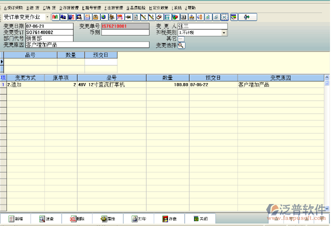 注意:選擇需要變更的受訂單,雙擊變更方式,可以變更原受訂單的產(chǎn)品,數(shù)量(增加或減少)以及預(yù)交日。