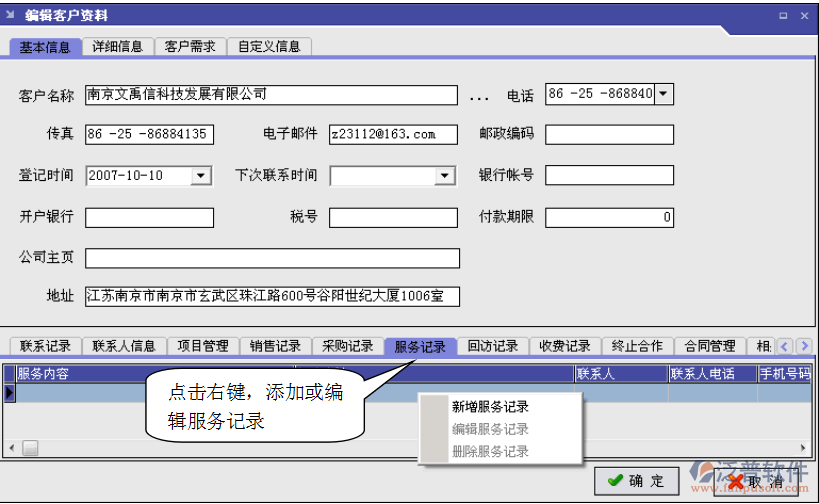 按欄目依次填寫好相應(yīng)的內(nèi)容,點擊確定即記錄此次客戶服務(wù)的服務(wù)內(nèi)容了。