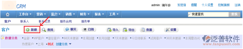 用戶進(jìn)入CRM系統(tǒng)后,點(diǎn)擊導(dǎo)航欄“客戶”,進(jìn)入“客戶”序時(shí)簿界面,然后點(diǎn)擊菜單欄里的新建按鈕,如下圖所示: