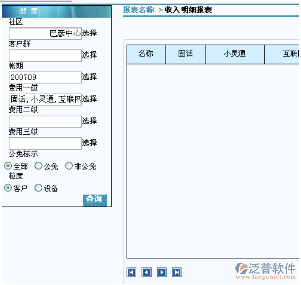 2. 切換到收入明細報表搜索頁,可提供的基本搜索條件包括:社區(qū),帳期,費用一級。更多查詢包括了費用二級,費用三級,客戶群,統(tǒng)計方式(按設備、按客戶)。同時按不同級別的人員,限定了查詢條件是否可選擇,除統(tǒng)計方式是單選按鈕選擇其他搜索項都是彈出頁面式選擇。社區(qū)、帳期和費用一級為必選項。