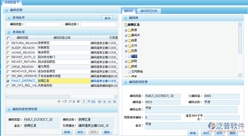 2.打開菜單界面如下圖:主要分四個(gè)功能區(qū)域,編碼類型管理維護(hù)區(qū)域、編碼類型查詢區(qū)域、編碼樹及編碼原因展現(xiàn)區(qū)域、編碼原因維護(hù)管理;