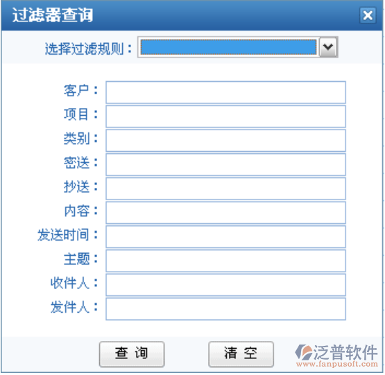 選擇不同的過濾規(guī)則,進(jìn)行查詢,過濾器字段包含有用戶自定義字段,因此可以對用戶的自定義信息進(jìn)行查詢,過濾器應(yīng)用是郵件系統(tǒng)的一個(gè)特色功能;除了應(yīng)用過濾器查詢外,系統(tǒng)默認(rèn)的常規(guī)查詢?nèi)缦聢D: