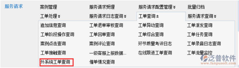 1) 菜單路徑:【客戶服務(wù)】->【服務(wù)請(qǐng)求】->【工單查詢】->【外系統(tǒng)工單查詢】,點(diǎn)擊打開(kāi)菜單;