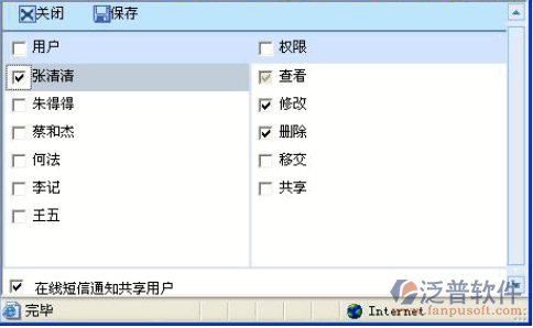 共享操作將記錄共享給其他用戶,便于相互配合開展業(yè)務(wù)。共享操作時(shí),可以賦予共享者相應(yīng)的權(quán)限,除查看記錄外,還可賦予修改、刪除、移交和共享記錄的權(quán)限。共享操作還提供了在線短信通知。