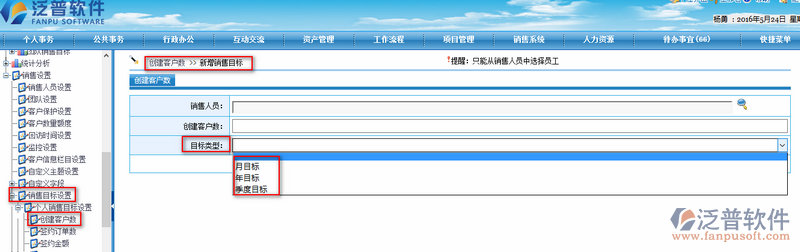 3、打開【銷售系統(tǒng)】--【銷售設置】--【創(chuàng)建客戶】,在新增銷售目標界面目標類型欄目可選擇(系統(tǒng)中其他需要選擇的時候,都可以同步,以上只表示其中一個模塊的選擇添加),也可看到上文中設置的分類,如下圖所示: