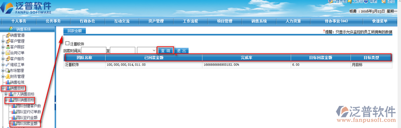 打開(kāi)【團(tuán)隊(duì)銷(xiāo)售目標(biāo)】--【團(tuán)隊(duì)回款金額】可查詢(xún)到自己回款金額的目標(biāo),可了解當(dāng)前已完成多少,所占百分比。如下圖所示: