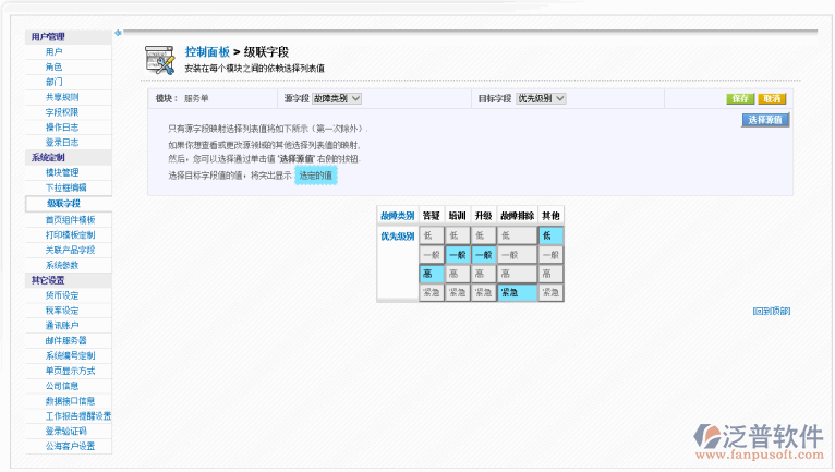 點擊“下一步”后,打開如下圖所示界面,第一行顯示的是“故障類別”字段,下面的行顯示為目標字段“優(yōu)先類別”,現(xiàn)在我們就可以設置級聯(lián)關系了,如設置故障類別“答疑”對應的優(yōu)先級別為“高”,則只需要將答疑下面的“低”、“一般”、“緊急”都點中(點中后顯示為灰白色)即可,后面依次類推,如圖: