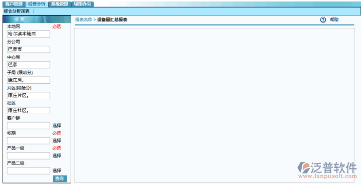 1. 查詢?cè)O(shè)備量匯總報(bào)表,點(diǎn)擊“經(jīng)營(yíng)分析”模塊下的“綜合分析報(bào)表”功能點(diǎn)里的“設(shè)備量匯總報(bào)表”子功能點(diǎn)。
