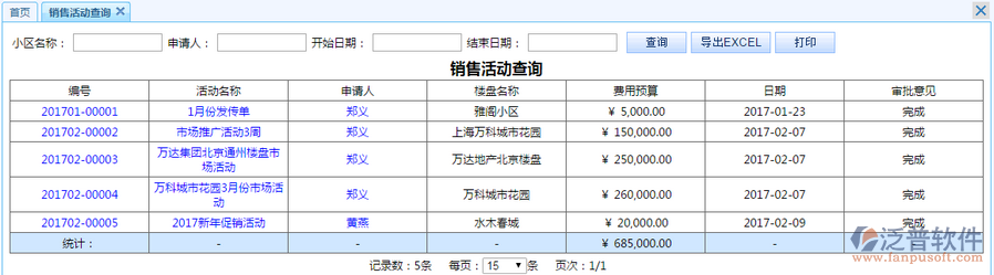 可根據(jù)小區(qū)名稱(chēng)、申請(qǐng)人、起止時(shí)間查詢(xún)銷(xiāo)售活動(dòng)情況(報(bào)表上藍(lán)色字體可鏈接到原數(shù)據(jù)表單)