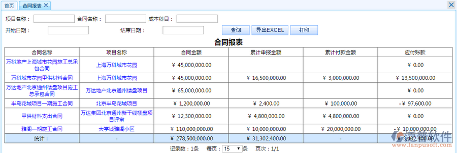 2、通過(guò)房地產(chǎn)管理系統(tǒng)可以任意查詢(xún)某個(gè)項(xiàng)目下的合同總額、累計(jì)完成進(jìn)度產(chǎn)值金額、房地產(chǎn)投資方累計(jì)支付給施工承包商的金額以及自動(dòng)生成應(yīng)付款項(xiàng)