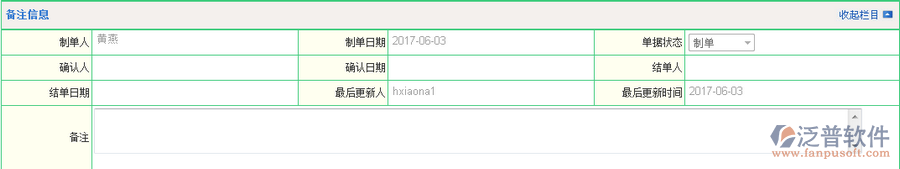 3、備注信息:制單人(當(dāng)前用戶)、制單日期(當(dāng)前日期)、單據(jù)狀態(tài)(缺省為制單)、備注、確認(rèn)人、確認(rèn)日期、結(jié)單人、結(jié)單日期、最后更新人、最后更新時間。