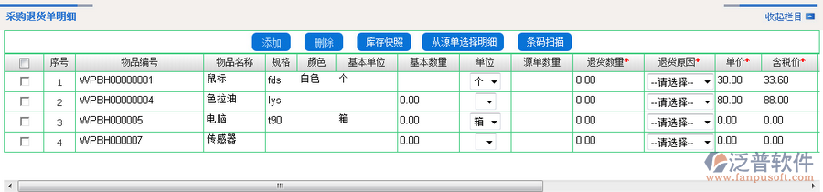 4、采購?fù)素泦蚊骷?xì):序號(自動)、物品編號、物品名稱、規(guī)格、單位、到貨數(shù)量、退貨數(shù)量、退貨原因(選擇)、單價、含稅價、稅率%、金額、含稅金額、稅額、備注、源單編號、源單序號。