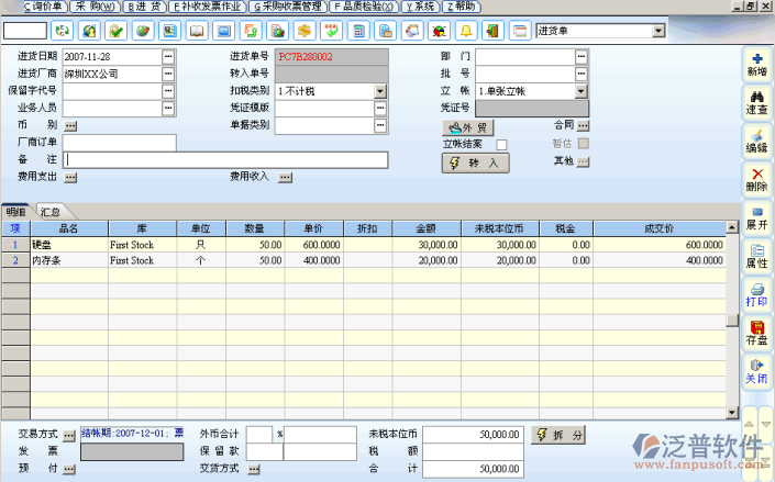 · 一張采購(gòu)單可以分批進(jìn)貨,一次進(jìn)貨可以取多張采購(gòu)單
