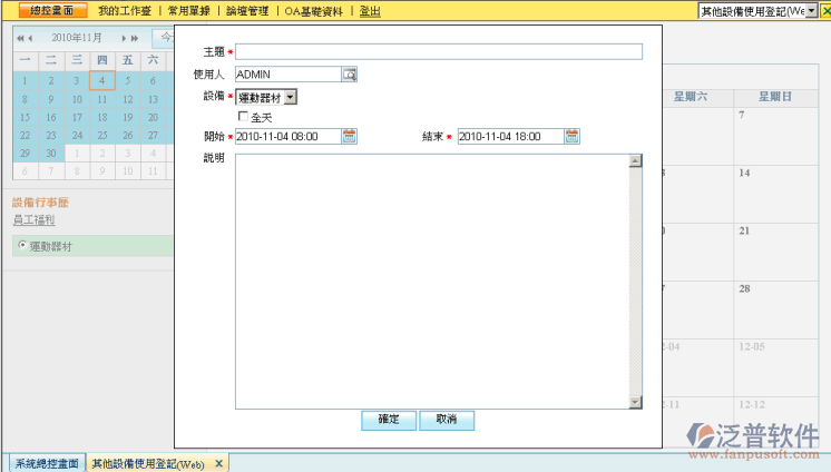 Ø 根據(jù)實(shí)際填寫主題、設(shè)備、使用時(shí)間、說明,點(diǎn)擊確定,即可保存。