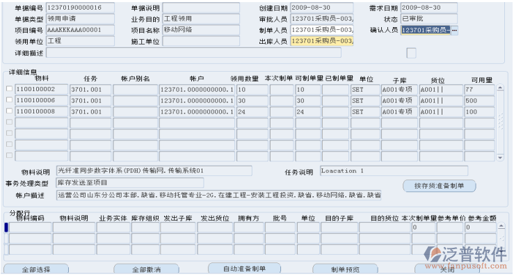 可采用“全部選擇”或“全部撤銷”鍵,快速操作選擇物資行。選擇“詳細(xì)信息”框內(nèi)的行,點(diǎn)擊“按存貨準(zhǔn)備制單”,可手工選擇需要出庫的物資,也可采用“自動(dòng)準(zhǔn)備制單”操作,則系統(tǒng)按照已選則的子庫、貨位、批次等信息作為本次出庫對(duì)應(yīng)的子庫、貨位、批次。