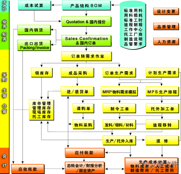 二、 生產(chǎn)管理:物料清單(BOM)及成本、生產(chǎn)工藝、生產(chǎn)計劃制作、生產(chǎn)指令單、物料需求分析、采購計劃、生產(chǎn)備料、生產(chǎn)領料、生產(chǎn)退料、生產(chǎn)工藝及計件(MES)、外發(fā)加工、生產(chǎn)進度分析。