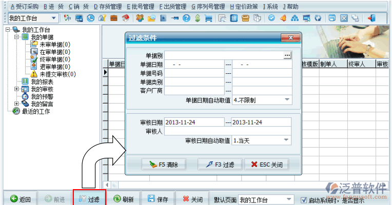 4、 在查詢未審核單據(jù)、終審單據(jù)、退審核單據(jù)等信息時,如顯示內(nèi)容不齊全,則要注意下方的過濾設(shè)置條件查詢窗口里的日期有沒有選擇正確,如下圖: