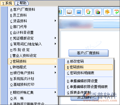 例:某企業(yè)倉(cāng)管員只對(duì)于進(jìn)貨單、進(jìn)貨退回單、進(jìn)貨單報(bào)表的信息可以有對(duì)應(yīng)的權(quán)限,對(duì)進(jìn)貨折讓單和廠商進(jìn)價(jià)記錄系統(tǒng)就可以通過“密碼管理”設(shè)置實(shí)現(xiàn)。
