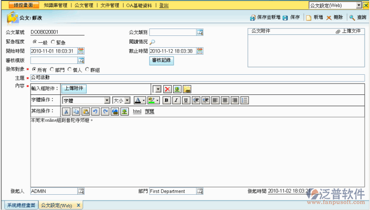 ² 部門:表示公文發(fā)布給某部門,選擇某部門后,只有屬于該部門的人員才能看到此 公文。