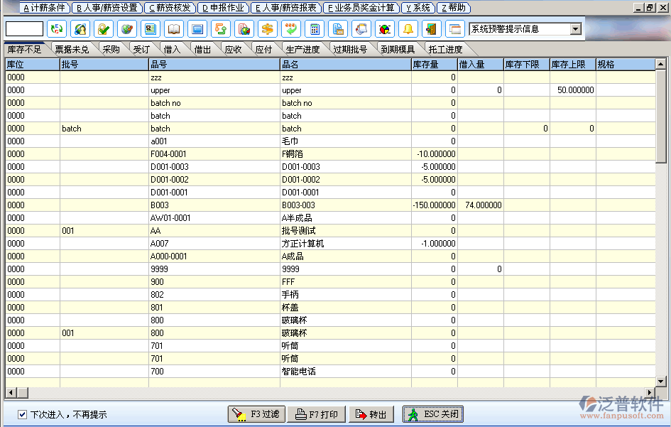 針對(duì)庫存不足、票據(jù)未兌、采購(gòu)到期未送達(dá)、受訂到期未出貨、借入借出已過期仍未歸還、應(yīng)收付帳款已過結(jié)帳日未結(jié)清者、生產(chǎn)進(jìn)度延后等信息狀況,在此預(yù)警窗口列明細(xì)提示。