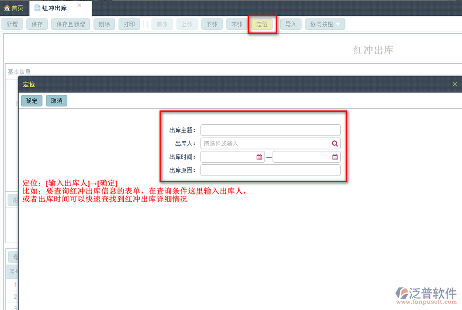 (3)、定位:點(diǎn)擊定位,通過輸入查詢條件就可以查詢紅沖出庫單據(jù)詳細(xì)情況。比如:要查詢一個(gè)紅沖出庫的情況,在查詢條件那里輸入出庫名稱或者原單劃類型,然后點(diǎn)擊確定,就可以查詢到該紅沖出庫詳細(xì)單據(jù)
