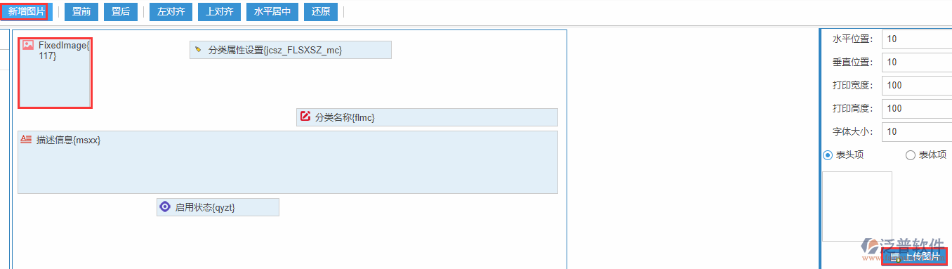 【新增圖片】:在打印的時(shí)候也可自定義新增圖片,增加之后可以在右側(cè)屬性里面對(duì)高寬度進(jìn)行調(diào)整,包括字體大小以及顯示的是表體還是表尾進(jìn)行設(shè)置,同時(shí)進(jìn)行圖片上傳。