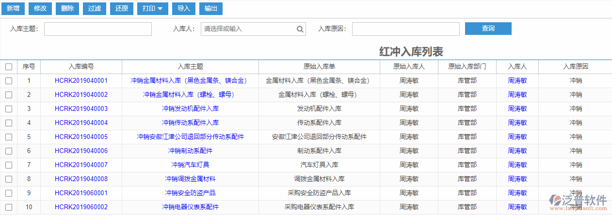 依次點擊【庫存】—【入庫管理】—【紅沖入庫列表】,可根據(jù)入庫主題、入庫人、入庫原因查詢紅沖入庫的情況,選擇需要的條件后點擊【查詢】即可,若無任何查詢條件,則顯示的是所有的紅沖入庫單據(jù)。