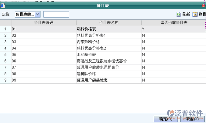“價格策略名稱”中輸入“水泥基價表”,在價目表中選擇剛才定義的“水泥基價表”如圖: