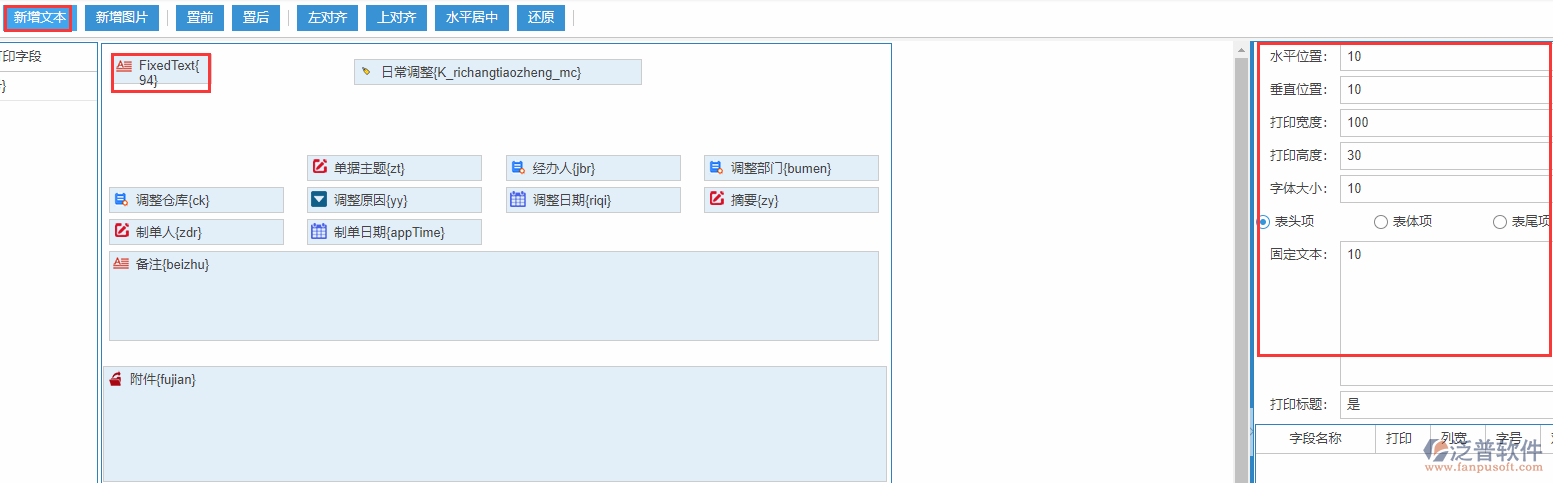 【新增文本】:可以自定義增加文本框,增加之后可以在右側屬性里面對高寬度進行調整,包括字體大小以及顯示的是表體還是表尾進行設置。