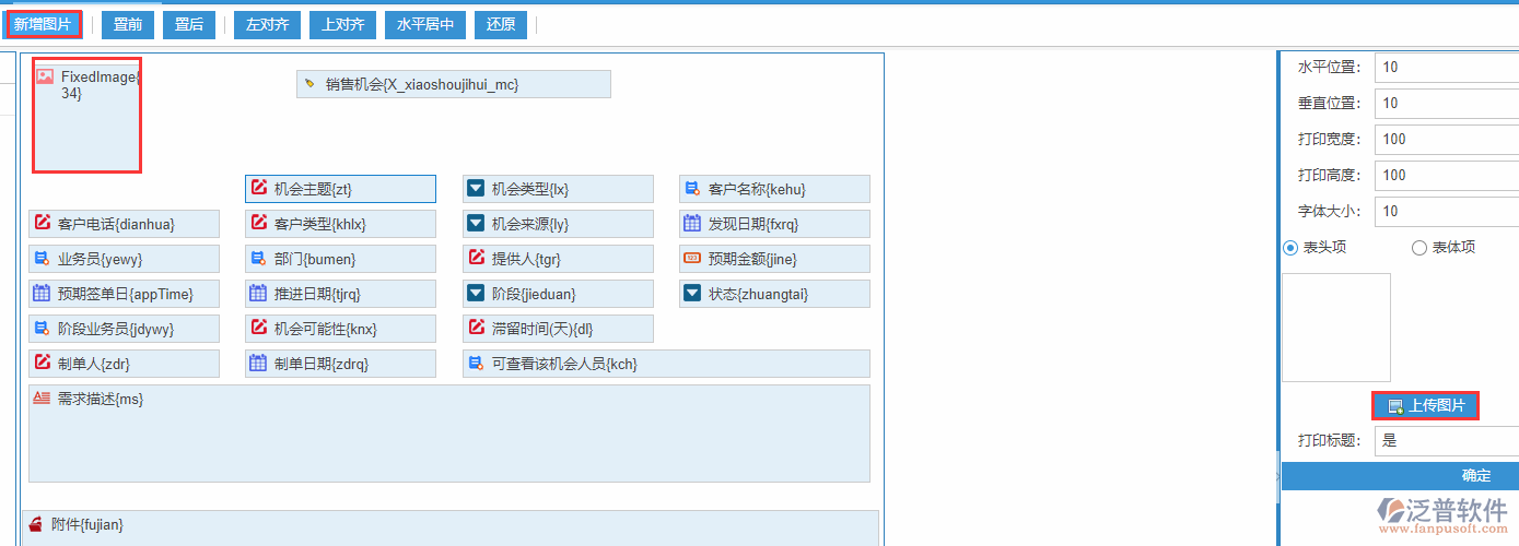 【新增圖片】:在打印的時(shí)候也可自定義新增圖片,增加之后可以在右側(cè)屬性里面對(duì)高寬度進(jìn)行調(diào)整,包括字體大小以及顯示的是表體還是表尾進(jìn)行設(shè)置,同時(shí)進(jìn)行圖片上傳。