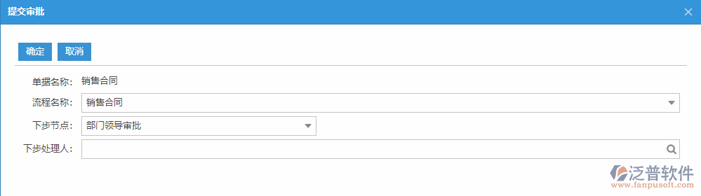 【提交審批】:可在此對(duì)當(dāng)前單據(jù)進(jìn)行流程審核提交,選擇下步節(jié)點(diǎn)和下步處理人后點(diǎn)擊【確定】即可。