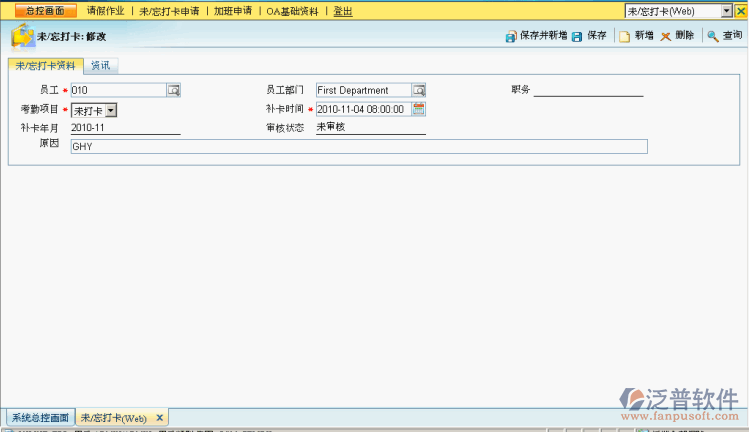 2、功能:主要針對員工未打開或忘記打卡的情況,進行補單的處理,員工因未打卡、忘打卡或因出差不能打卡,或打卡機器出現(xiàn)公章等原因不能正常打卡的情況下,用戶可通過此單據(jù)進行記錄考勤作業(yè)。當單據(jù)保存后,需要審核通過才能生效,除制單人之外的任何用戶都可以進行審核,前提是用戶有進入[審核未/忘打卡]頁面的權限;如果有設置審核流程,那么需要在審核人審核通過后才能生效。