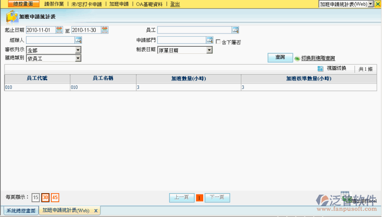 1、菜單:[日常辦公] à[考勤管理]à [加班申請]à[加班申請統(tǒng)計表]