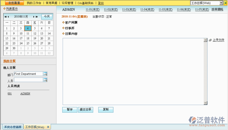 ★ 進(jìn)入[協(xié)同辦公]→[工作中心]→[我的工作臺]→[工作日報]頁面。