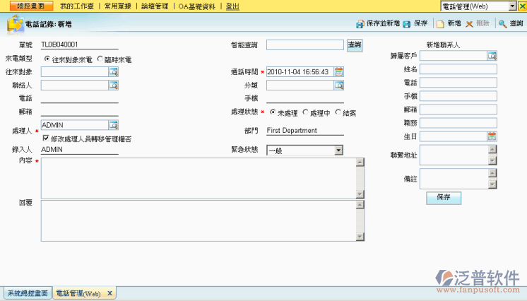 Ø 聯絡人:本次來電的聯系人資料,如果為臨時來電則不可選擇;如果是往來來電,則提供資料選擇;另外可通過頁面右邊直接新增聯系人而帶出。