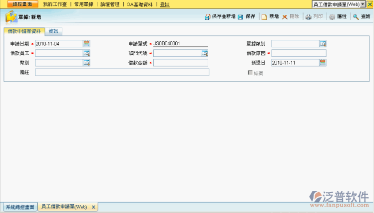 Ø 進入[日常辦公] →[工作中心]→[常用單據(jù)]→[員工借款申請單(Web)]打開頁面。