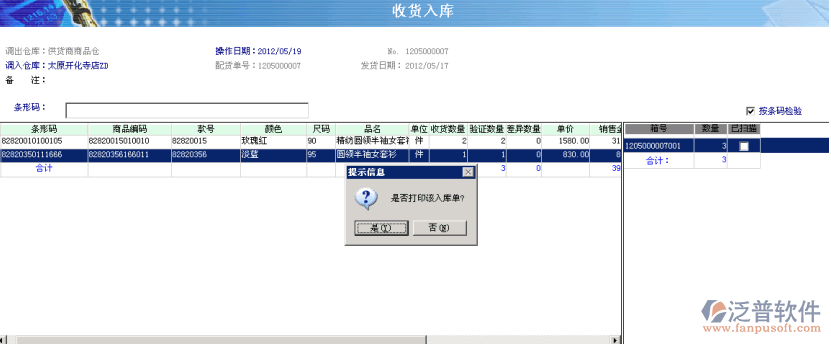 5、此時(shí)入庫操作結(jié)束,在彈出的“是否打印入庫單”的對(duì)話框中,如配有打印機(jī)需要打印入庫單則選擇”是”,否則選擇”否”將不會(huì)打印。選擇工具欄的 左上角的退出按鈕 ,退回到收貨入庫界面。如果有入庫單據(jù)繼續(xù)上面的操作。