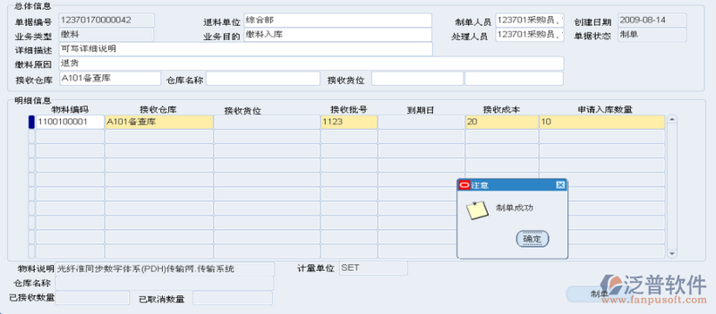 在明細信息中錄入“物料編碼”,“接收倉庫”,“接收貨位”,“接收批號”,“接收成本”,“申請入庫數(shù)量”等信息。點擊“制單”。