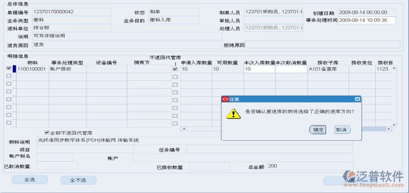 在頭信息中錄入“退料單位”,“業(yè)務(wù)目的”,“詳細描述”,“繳料原因”,“接收倉庫”,“接收貨位”等信息。選擇“處理人員”。