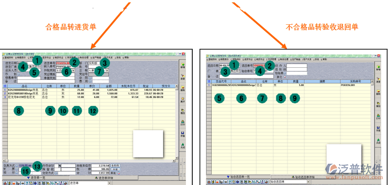 系統(tǒng)自動(dòng)生成“入庫(kù)驗(yàn)收單”(如圖GB2所示)后,檢驗(yàn)員根據(jù)檢驗(yàn)結(jié)果填寫(xiě)“合格量”、“不合格量”和“不合格原因”,按下“轉(zhuǎn)單據(jù)”按鈕生成“進(jìn)貨單”(如GB2.4所示)或“驗(yàn)收退回單”(如GB2.5所示)。