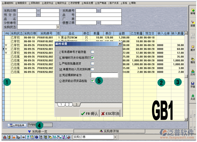 通過(guò)“菜單”→“采購(gòu)詢價(jià)”→“采購(gòu)訂單”打開(kāi)界面GB1。若您的企業(yè)對(duì)于原料,無(wú)需檢驗(yàn)便可直接入庫(kù),則可以關(guān)閉“進(jìn)貨前必須貨品檢驗(yàn)”選項(xiàng),見(jiàn)圖GB1.5。您可先通過(guò)“查詢欄”過(guò)濾出合適的采購(gòu)單,然后選擇采購(gòu)單,轉(zhuǎn)檢驗(yàn)單。