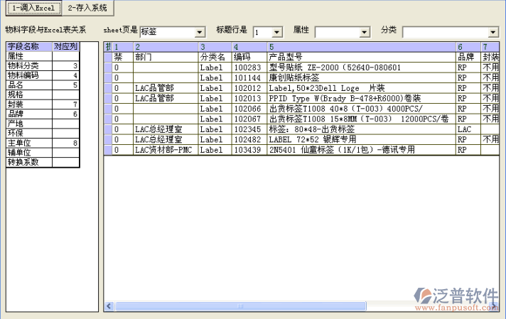 單擊“調(diào)入EXCEL”按鈕,調(diào)入物料表,在sheet頁(yè)下拉列表框選擇要導(dǎo)入的那一頁(yè),然后選擇屬性列表框。最后單擊“存入系統(tǒng)”按鈕將當(dāng)前網(wǎng)格中的物料導(dǎo)入到系統(tǒng)中。