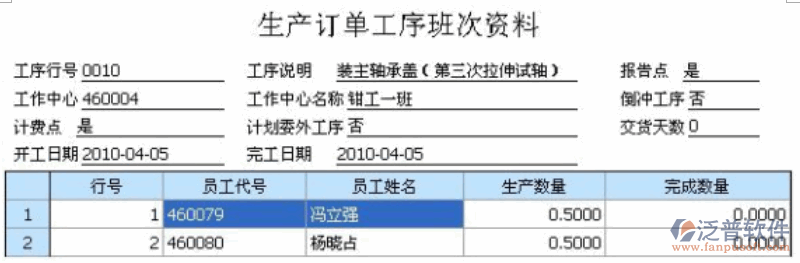 如果〖派工標(biāo)識(shí)〗(上圖表格右側(cè))列有“*”出現(xiàn),表示該工序已經(jīng)派工,如果為空,表示該工序等待派工。雙擊派工行,可以派工或者查看派工信息,如下圖所示。其中〖員工代碼〗必填,生產(chǎn)數(shù)量默認(rèn)為生產(chǎn)訂單上的數(shù)量,允許修改,可分派給一人或多人,但是總和不得大于生產(chǎn)訂單上的數(shù)量。如果派工單的生產(chǎn)數(shù)量少于生產(chǎn)訂單上的生產(chǎn)數(shù)量,仍須進(jìn)行派工,直到將生產(chǎn)訂單上的數(shù)量派完為止。