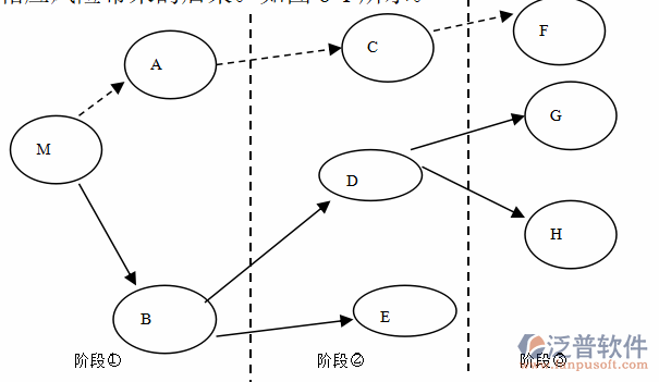 把ERP項(xiàng)目從選型至啟動(dòng)活動(dòng)分為①,②,③三個(gè)階段,每個(gè)階段又存在若干策略和相應(yīng)的風(fēng)險(xiǎn)后果,例如在①階段,有兩種ERP系統(tǒng)(A, B>(均為成熟而又符合本公司特性的ERP系統(tǒng))供HN企業(yè)選擇,即M-A, M-B。當(dāng)M-B策略實(shí)施后,到達(dá)相應(yīng)的風(fēng)險(xiǎn)結(jié)果D和E(即有兩家豐富實(shí)施經(jīng)驗(yàn)的ERP咨詢公司來實(shí)施),現(xiàn)在ZT企業(yè)所面臨的問題就是,應(yīng)以B為基準(zhǔn)思考點(diǎn)去尋求哪家咨詢公司來實(shí)施的問題,即B-E, B-D策略中的最優(yōu)策略,力求獲取最小風(fēng)險(xiǎn)和最大利益。此時(shí)的利益與A, C己無關(guān),即風(fēng)險(xiǎn)決策的無后效性。這里形成的風(fēng)險(xiǎn)狀態(tài)和決策從M向B的轉(zhuǎn)換,稱為風(fēng)險(xiǎn)的遷移特性。同理有第三步實(shí)施計(jì)劃的選擇,最后啟動(dòng)ERP項(xiàng)目。