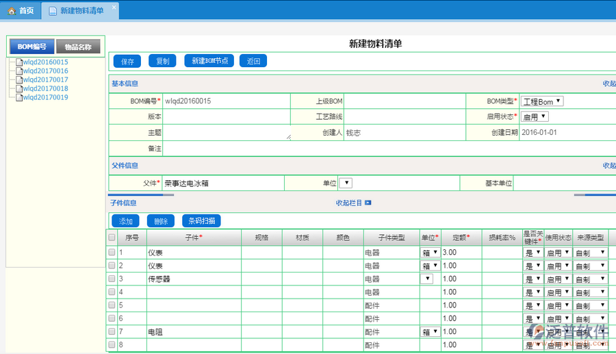 1.點(diǎn)擊辦公模式→生產(chǎn)管理→物料清單→新建物料清單,進(jìn)入“新建物料清單”窗口: