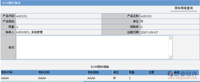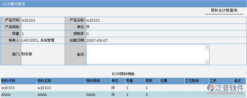 用料明細(xì)查詢:查詢結(jié)果顯示所有層數(shù)和用料明細(xì)數(shù)。