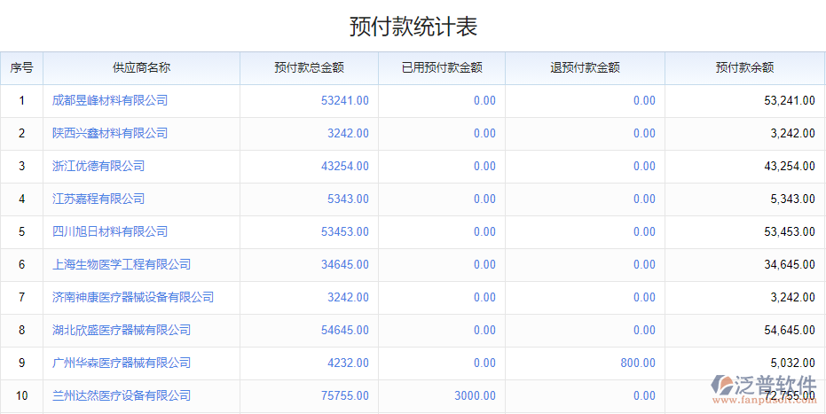 2、每個供應商下,企業(yè)預付了多少費用給供應商,供應商償付了多少數(shù)額的貨品給企業(yè),退了多少余款都統(tǒng)計顯示出來,每一項都可以超鏈接查閱詳情。系統(tǒng)自動計算還有多少預付款存在供應商那里。
