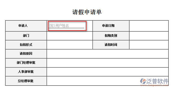 其他單元格的控件依樣添加,不同控件需填寫的屬性不一樣,請(qǐng)參考《表單控件使用說明》。下面為設(shè)計(jì)完成的請(qǐng)假單。