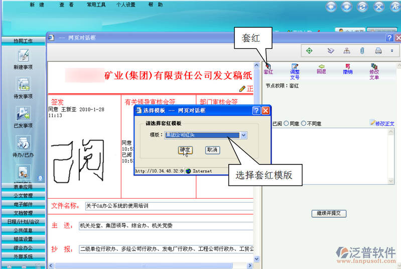 公文編號(hào)后,公文流程返回發(fā)起者,進(jìn)入處理界面,修改發(fā)文卡片上的印發(fā)日期,印發(fā)份數(shù),在處理界面上選擇套紅→選擇相應(yīng)的套紅模版。如下圖: