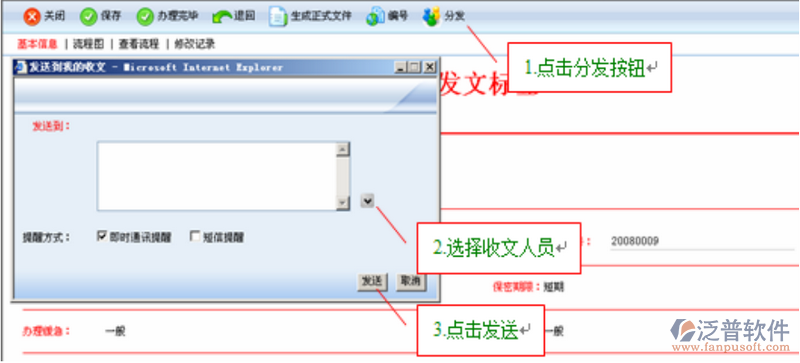 正文套紅、用印完成后返回標(biāo)簽頁面,點擊上方功能欄中的“分發(fā)”按鈕,在彈出的窗口中選擇文件發(fā)送范圍后,點擊“發(fā)送”即可。